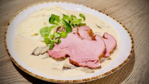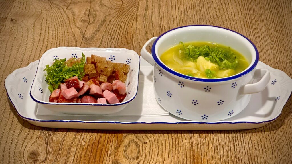 Menu Menu Wochenendangebot Kohlsuppe auf Wein mit Brandy, geräuchertem Fleisch, Käse, Erbsen und Croutons 85,- Geräucherte Schweinenacken mit Pilzsoβe, Semmelknödel 249,-